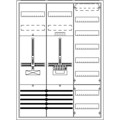 2CPX054442R9999 ABB: Meter board, series ComfortLine A, fully assembled cabinet, with Metering cross, Expansion option: Lateral, for the internal use, with Door, class of protection II (double insulated), degree of protection IP54, Impact strength IK07, Rated operational voltage 400V AC 50/60 Hz, rated current 63 A, Powder-coated, in RAL 9016, enclosure out of sheet steel, double door, door out of sheet steel, with Standard closure, door opening angle 120 degree, door hinge right and left, rear wall out of sheet steel / plastic, cable entry on top via membrane flange mounted, on bottom via 2x cable entry flange included, on side via flange opening pre-punched, rear wall cable entry part is pre-punched, dimensions in mm (H x W x D): 1100 x 800 x 215, Metering module pre-wired, Earthing system TN-S, 5-pole, Quick terminal for metering, net side compartment, meter space: with busbar, pre-assembled for main switch SH, incoming terminals up to 35 mm², system side compartment, meter space: with Main branch terminal, Number of meter spaces single tariff 1, Number of reserve spaces 1, Number of distributor rows 7, Grid unit 7 GU, Overall height 3, panel width 3, Space units 216, covers out of Plastic, RAL 7035