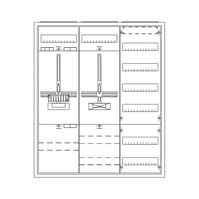 2CPX054469R9999 ABB: Meter board, series ComfortLine A, fully assembled cabinet, with Metering cross, Expansion option: Lateral, for the internal use, with Door, class of protection II (double insulated), degree of protection IP31, applicable standards: DIN VDE 0603-2-1, VDE AR-N 4100:2019-04, Impact strength IK07, Rated operational voltage 400V AC 50/60 Hz, rated current 63 A, Powder-coated, in RAL 9016, enclosure out of sheet steel, double door, door out of sheet steel, with Standard closure, door opening angle 120 degree, door hinge right and left, rear wall out of sheet steel / plastic, cable entry on top via membrane flange mounted, on bottom via 2x cable entry flange included, on side via flange opening pre-punched, rear wall cable entry part is pre-punched, dimensions in mm (H x W x D): 1100 x 800 x 215, Metering module pre-wired, Earthing system TN-S, 5-pole, Direct connection, net side compartment, meter space: with busbar, pre-assembled for main switch SH, incoming terminals up to 25 mm², system side compartment, meter space: with Main branch terminal, Number of meter spaces single tariff 1, Number of SG spaces 1, Number of distributor rows 5, Grid unit 7 GU, Overall height 3, panel width 3, Space units 252, covers out of Plastic, RAL 7035