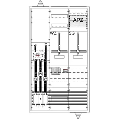 2CPX056144R9999 ABB: Measurement and metering transformer cabinet, series TwinLine, fully assembled cabinet, with Metering cross, for the internal use, with Door, class of protection II (double insulated), degree of protection IP55, applicable standards: DIN VDE 0603-2-2, VDE AR-N 4100:2019-04, Rated operational voltage 415V AC 50/60 Hz, rated current 200 A, Rated current of the assembly of switchgear and controlgear InA 200 A, Powder-coated, in RAL 7035, enclosure out of Sheet steel / Plastic, single-leaf door, dimensions in mm (H x W x D): 1400 x 800 x 225, Earthing system TN-S, 5-pole, Number of SG spaces 1, Number of transformer meter spaces 1, Pre-wired according requirements DSO, voltage path 3 low voltage path switches B10/25kA overvoltage path category 3, busbar system Cu busbars 12 x 5 mm 5-pole, parting point before the current transformer Fuse base for NH2/400 A, current transformer range CT mounting pad with CT rail 170 x 30 x 5 mm, parting point after the current transformer Switch disconnector 250 A / 4-pole, primary wiring L1-L3 Cu-Busbar 30 x 5 und 20 x 5, PE+N Cu-Busbar 20 x 5 mm, Connection N+PE (M8), Grid unit 9 GU, Overall height 5, panel width 3, Space units 324, covers out of Plastic, Quick sealable connection, RAL 7035