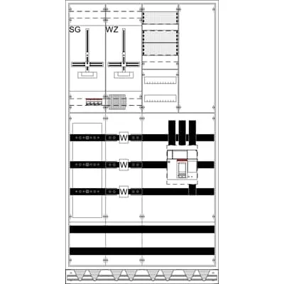 2CPX056150R9999 ABB: Measurement and metering transformer cabinet, series TwinLine, fully assembled cabinet, with Metering cross, for the internal use, with Door, class of protection II (double insulated), degree of protection IP55, applicable standards: EN 61439-1, EN 61439-2, Rated operational voltage 415V AC 50/60 Hz, rated current 585 A, Rated current of the assembly of switchgear and controlgear InA 585 A, Powder-coated, in RAL 7035, enclosure out of sheet steel, double door, dimensions in mm (H x W x D): 1950 x 1050 x 400, Earthing system TN-S, 5-pole, Number of SG spaces 1, Number of transformer meter spaces 1, Pre-wired according requirements DSO, voltage path 4 low voltage path switches B10/36kA overvoltage path category 4, busbar system Cu busbars 50 x 10 mm 5-pole, parting point before the current transformer Space for 2 Fuse switch disconnector NH1/2/3, current transformer range CT mounting pad with CT rail 250 x 40 x 10 mm, parting point after the current transformer Switch disconnector 1250 A / 3-pole, PE+N-busbar Cu 40 x 10 mm, Grid unit 12 GU, Overall height 8, panel width 4, Space units 576, covers out of Plastic, Quick sealable connection, RAL 7035