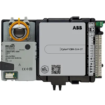 2CQG201515R1011 ABB: BACnet B-AAC single-duct VAV terminal unit controller with integrated actuator. Controller features 2 UniPutsTM (software configured for AI, AO, DI or DO), 4 UI and 3 DO (Triac). Built-in differential pressure transducer (0-1.3"w.c., 0...320 Pa) and actuator (45in-lb, 5 Nm). Freely programmable, c/w pre-loaded factory configuration strategy with imperial units (degF) and FusionAir support.