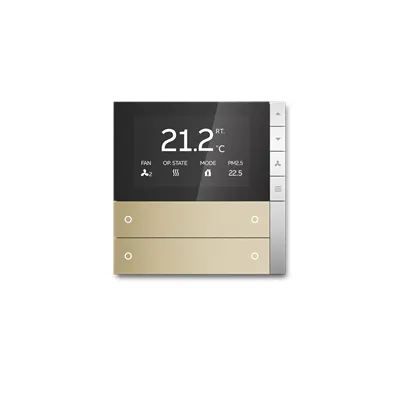 2TAZ730210R4110 ABB: ABB i-bus®KNX sensor PEONIA® control element 2/4-fold with Room Temperature Controller, FM. With integrated bus coupling unit and temperature sensor. Proximity sensor, energy saving function. Switch contact left/right. Replaceable rocker without icon. Push button function: switching/dimming/blind/value sending/step-type switch/lightscene/ fan function. With base-load operation. The controller is a constant room temperature controller for ventilator convectors (fan-coil) in 2 and 4 pipe system and conventional heating and cooling systems. The fan stage can be switched manually or automatic mode. Dedicated capacitive touch RTC control button with vibration feedback, Single/Master/Slave configuration. Display element: TFT display, showing operation mode, temperature, option: time, PM2.5, CO2, Humidity, VOC, room temperature. Display element: TFT display, showing dynamic animation for dimming, blind, scene. Individual programmable LED per rocker. Top and bottom ambient LED strip. LED colour: red/green/yellow/blue/red-orange/violet/white.