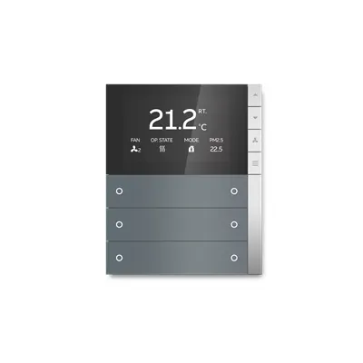 2TAZ730310R1510 ABB: ABB i-bus®KNX sensor PEONIA® control element 3/6-fold with Room Temperature Controller, FM. With integrated bus coupling unit and temperature sensor. Proximity sensor, energy saving function. Switch contact left/right. Replaceable rocker without icon. Push button function: switching/dimming/blind/value sending/step-type switch/lightscene/ fan function. With base-load operation. The controller is a constant room temperature controller for ventilator convectors (fan-coil) in 2 and 4 pipe system and conventional heating and cooling systems. The fan stage can be switched manually or automatic mode. Dedicated capacitive touch RTC control button with vibration feedback, Single/Master/Slave configuration. Display element: TFT display, showing operation mode, temperature, option: time, PM2.5, CO2, Humidity, VOC, room temperature. Display element: TFT display, showing dynamic animation for dimming, blind, scene. Individual programmable LED per rocker. Top and bottom ambient LED strip. LED colour: red/green/yellow/blue/red-orange/violet/white.