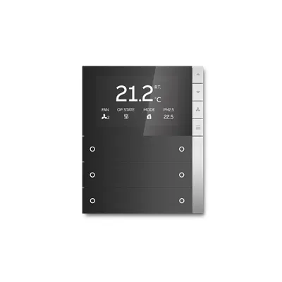 2TAZ730310R2010 ABB: ABB i-bus®KNX sensor PEONIA® control element 3/6-fold with Room Temperature Controller, FM. With integrated bus coupling unit and temperature sensor. Proximity sensor, energy saving function. Switch contact left/right. Replaceable rocker without icon. Push button function: switching/dimming/blind/value sending/step-type switch/lightscene/ fan function. With base-load operation. The controller is a constant room temperature controller for ventilator convectors (fan-coil) in 2 and 4 pipe system and conventional heating and cooling systems. The fan stage can be switched manually or automatic mode. Dedicated capacitive touch RTC control button with vibration feedback, Single/Master/Slave configuration. Display element: TFT display, showing operation mode, temperature, option: time, PM2.5, CO2, Humidity, VOC, room temperature. Display element: TFT display, showing dynamic animation for dimming, blind, scene. Individual programmable LED per rocker. Top and bottom ambient LED strip. LED colour: red/green/yellow/blue/red-orange/violet/white.
