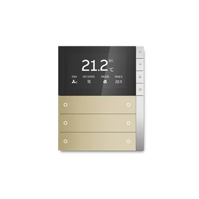 2TAZ730310R4110 ABB: ABB i-bus®KNX sensor PEONIA® control element 3/6-fold with Room Temperature Controller, FM. With integrated bus coupling unit and temperature sensor. Proximity sensor, energy saving function. Switch contact left/right. Replaceable rocker without icon. Push button function: switching/dimming/blind/value sending/step-type switch/lightscene/ fan function. With base-load operation. The controller is a constant room temperature controller for ventilator convectors (fan-coil) in 2 and 4 pipe system and conventional heating and cooling systems. The fan stage can be switched manually or automatic mode. Dedicated capacitive touch RTC control button with vibration feedback, Single/Master/Slave configuration. Display element: TFT display, showing operation mode, temperature, option: time, PM2.5, CO2, Humidity, VOC, room temperature. Display element: TFT display, showing dynamic animation for dimming, blind, scene. Individual programmable LED per rocker. Top and bottom ambient LED strip. LED colour: red/green/yellow/blue/red-orange/violet/white.