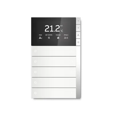 2TAZ730510R0010 ABB: ABB i-bus®KNX sensor PEONIA® control element 5/10-fold with Room Temperature Controller, FM. With integrated bus coupling unit and temperature sensor. Proximity sensor, energy saving function. Switch contact left/right. Replaceable rocker without icon. Push button function: switching/dimming/blind/value sending/step-type switch/lightscene/ fan function. With base-load operation. The controller is a constant room temperature controller for ventilator convectors (fan-coil) in 2 and 4 pipe system and conventional heating and cooling systems. The fan stage can be switched manually or automatic mode. Dedicated capacitive touch RTC control button with vibration feedback, Single/Master/Slave configuration. Display element: TFT display, showing operation mode, temperature, option: time, PM2.5, CO2, Humidity, VOC, room temperature. Display element: TFT display, showing dynamic animation for dimming, blind, scene. Individual programmable LED per rocker. Top and bottom ambient LED strip. LED colour: red/green/yellow/blue/red-orange/violet/white.