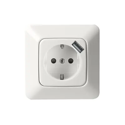 2TKA00003832 ABB: The socket outlet has an integrated USB charger 5V/0,7A with electronic short-circuit and overload protection. Power dissipation 0,1W. Compatible with USB devices, iPod and iPhone. The Schuko socket outlet is 16A/250V. There are screwless terminals for each contact of the socket outlet. The socket outlet insert has shutters. The terminals are for max 2 rigid wires. No X-terminals.