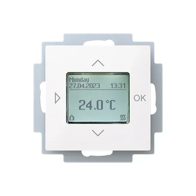 2TKA00005246 ABB: Thermostat with low insert (20 mm mounting depth) meeting the Ecodesign requirements. The thermostat is pre-programmed. Rated voltage 230 V AC ± 10% 50 Hz Output 1 no and connectors 1.5 mm² to 4 mm² Switching current 250 V AC / 16 (2) A, protection class II and protection class IP21. Operating temperature 0 ° C to 35 ° C and storage temperature -20 ° C to 70 ° C Clock Accuracy (at 20 ° C) <+/- 0.5 sec / min Power consumption (standby) <0.05 W Floor sensor NTC 10kΩ @ 25˚C and external control (EXT connector) 230V AC / 10µA (same phase).