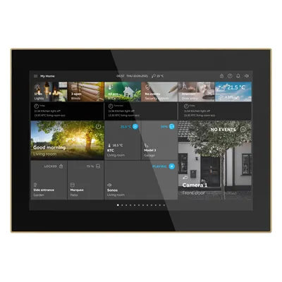 Control, observe and manage your entire installation on one device: Switching - Dimming - Slider - Blind - RGBW control element - Step switch - Scene switch - Display element - Audio control element. With scene function, logic functions, presence simulation and time programs. SmartTouch® 10” can also be used as an end device for communication with the ABB-Welcome outdoor stations, and as part of the ABB-Welcome door communication system.
