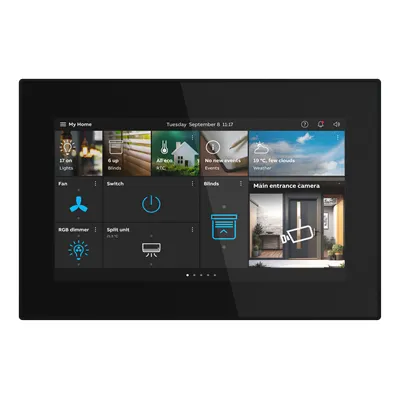 Control, monitor, and manage your entire system with one device: switching, dimming, sliders, blinds, RGBW control, step switch, scene switch, display element, and audio control.