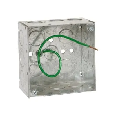 7TAA001050R0023 ABB: Square Box, 30.3 Cubic Inches, 4 Inch Square x 2-1/8 Inch Deep, 1/2 Inch and 3/4 Inch Eccentric Knockouts, Galvanized Steel, Welded Construction, Ground Bump and 10-1/2 Inch Solid #12 AWG Solid Ground Wire Pigtail, For use with Conduit