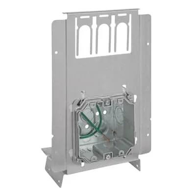 7TAA001650R2437 ABB: Pre-assembly with box to stud bracket and two cable supports, 4 inch pre-galvanized steel square box, box depth-2-1/8 inch, 1/2 inch and 3/4 inch eccentric knockouts, 5/8 inch raised one device box cover