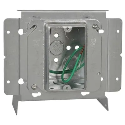 7TAA001980R0043 ABB: Pre-Fabricated, Two Gang Outlet Box, 30.3 Cubic Inches, 4 Inch Square x 2-1/8 Inch Deep, 1/2 and 3/4 Inch Eccentric Knockouts, 1 Inch Raised Box Cover, with Grounding #12 AWG Solid Ground Wire Pigtail and Box to Stud Bracket, For Use with Conduit