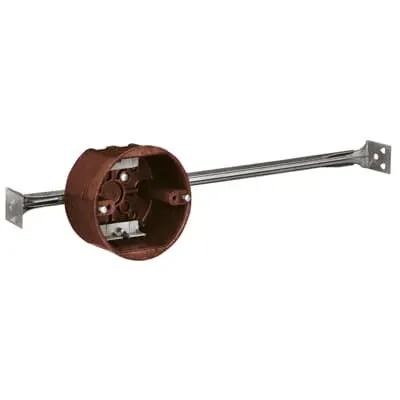 7TAA040430R0017 ABB: 4 in. 20.8 cu.in. round phenolic ceiling/fixture outlet box with adjustable bar hanger and non-metallic clamps.
