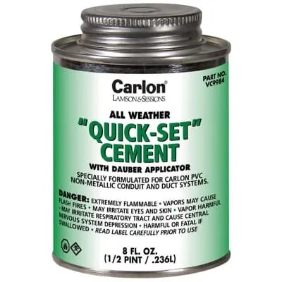 Feature → Business Impact → Application: All-Weather Quick-Set formula reduces cure time and increases outdoor usability, enabling faster turnarounds on exterior conduit runs and reducing field weather delays. Application: Suitable for Carlon PVC conduit, duct, wireway, and fittings up to 6 inches, boosting install confidence in varying climates. Feature → Business Impact → Application: 118 ml (1/4 pint) bottle with Dauber applicator minimizes waste and skews toward precise, spill-free joints. Application: Ideal for tight spaces and overhead installations where clean application matters. Feature → Business Impact → Application: Clear color improves joint inspection and quality control on visible installations, supporting code-compliant assemblies. Application: Useful for commercial and industrial electrical projects requiring clean aesthetics and traceable joins. Feature → Business Impact → Application: 24-piece packaging supports bulk stocking, reducing logistics handling and labor time. Application: Distribution and contractor teams benefit from quicker replenishment and reduced downtime. Feature → Business Impact → Application: Compatibility with Carlon system components ensures warranty alignment and predictable performance. Application: simplifies procurement and minimizes compatibility checks during project design.