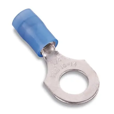 7TAI029850R0009 ABB: Nylon Insulated Ring Terminal, Length 1.08 Inches, Width .47 Inches, Maximum Insulation .162, Bolt Hole 1/4 Inch, Wire Range #18-#14 AWG, Color Blue, Copper, Tin Plated, 1,000 Pack