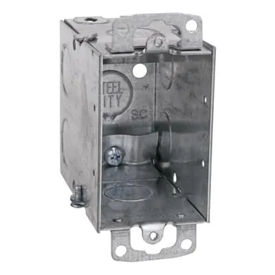 7TBA001500R0056 ABB: Gangable Switch Box, 18 Cubic Inches, 3 Inches Long x 2 Inches Wide x 3-1/2 Inches Deep, 1/2 Inch Knockouts, Pre-Galvanized Steel, Non-Metallic Cable Clamps (C-5), 10-1/2 Inch #12 AWG Solid Pigtail and Ears Flush, For use with Non-Metallic Sheathed Cable