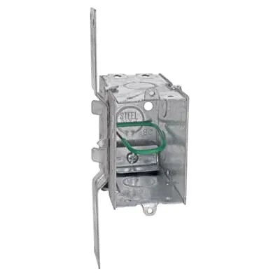 7TBA001500R0057 ABB: Gangable Switch Box, 18 Cubic Inches, 3 Inches Long x 2 Inches Wide x 3-1/2 Inches Deep, 1/2 Inch Knockouts, Pre-Galvanized Steel, Non-Metallic Cable Clamps (C-5), 10-1/2 Inch #12 AWG Solid Pigtail, and CV Bracket 7/8 Inches, For use with Non-Metallic Sheathed Cable