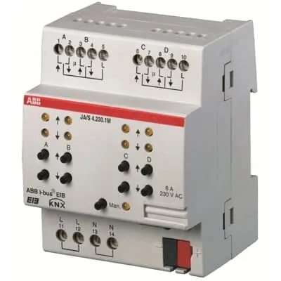 GHQ6310064R0111 ABB: Controls 4 independent shutter or sunblind drives including the functions Up/Down, Step/Stop, Move to position, Sun protection automatic control and Heating/cooling automatic control. Direct manual operation, with or without EIB/KNX voltage connected.