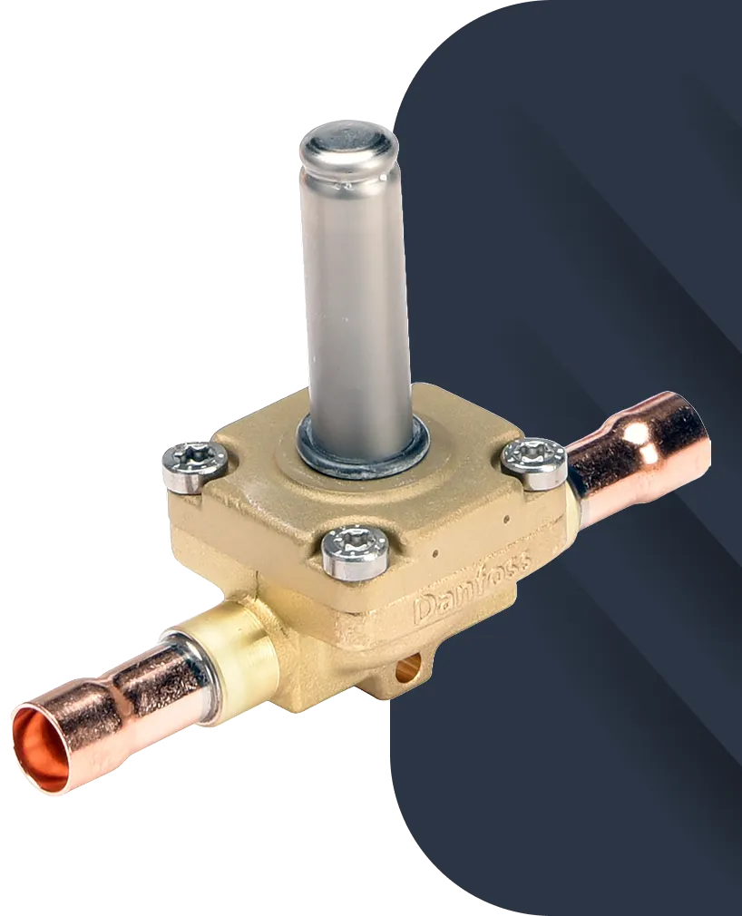 EV series refrigeration solenoid valves controlling refrigerant flow in commercial HVAC systems. Brass construction, normally closed operation, compatible with multiple refrigerants, essential for system control.