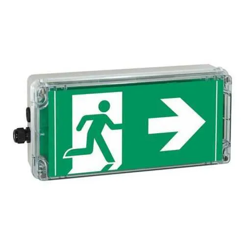 Yes. The EXIT 2 LED exit sign is designed for hazardous/classified locations, including Zone 2/Zone 22, with IP66 protection. Its wall-mountable design and durable polycarbonate housing withstand demanding environments. It is suitable for chemical plants, refineries, and offshore platforms where reliable emergency signaling and compliant pictograms are essential.