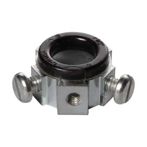HS1042 is a threadless, insulated throat bushing designed for rigid/IMC conduit entry into enclosures. Install by aligning the conduit through the knockout, seating the bushing, and tightening the set screw to clamp the conduit securely. Ensure grommets or seals per enclosure manufacturer guidelines to maintain enclosure integrity and moisture protection.