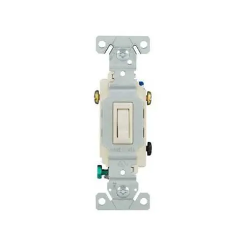 With a 15A at 120V rating and a single-pole configuration, this Eaton toggle switch delivers reliable residential lighting control. Designers gain predictable performance and clear compliance signals during system reviews, reducing design risk and avoiding costly change orders. The compact form factor supports efficient cabinet layouts in dense equipment rooms. Side and push wiring with screw terminals enables fast, secure terminations in tight panels. This wiring approach minimizes miswiring and simplifies field testing, while supporting #14-10 AWG conductors for common residential circuits. Installers benefit from consistent torque characteristics and straightforward re-termination during maintenance. The polycarbonate housing provides durable, impact-resistant construction with a light almond finish for straightforward aesthetic coordination in finished installations. Flush mounting meets standard gang box tolerances, easing retrofits and new-builds alike and reducing faceplate misalignment during installation. Load-type versatility extends to INC, CFL, ELV, MLV, LED, and motor-control applications, allowing a single SKU to serve multiple lighting and appliance scenarios. This compatibility lowers inventory costs and accelerates procurement decisions for electrical distributors and contractors. Torque rating of 14 lbf-in ensures proper termination without over-tightening screw connections, while the product dimensions—1.31 in depth, 3.28 in height, 0.88 in width—facilitate space-limited installations. The combination of force ratings and size helps maintain electrical panel integrity and reduce installation variance. Certification visibility includes cULus Listed, NOM, RoHS compliance, and NAFTA alignment, reinforcing regulatory acceptance and product traceability across markets. These certifications support faster sourcing and lower risk in maintenance cycles.