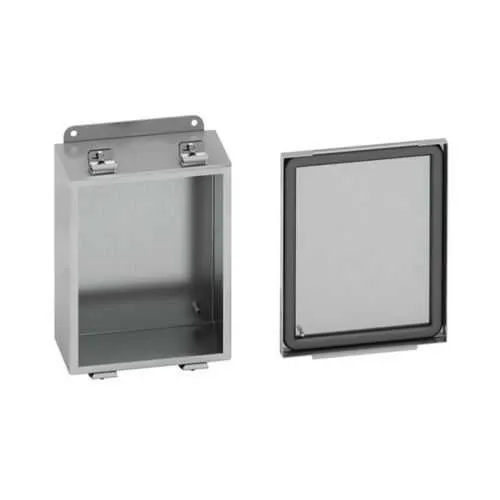 Feature: 304 stainless steel construction with a 16 gauge wall and a #4 brushed finish. Business impact: ensures superior corrosion resistance and structural integrity in challenging environments, reducing replacement frequency and downtime. Application: ideal for outdoor panels in chemical plants and washdown areas. Feature: Seamless poured-in-place gasket and NEMA 4X rating. Business impact: delivers reliable ingress protection against dust, water, and chemical splash, improving uptime and equipment reliability. Application: suitable for washdown facilities and outdoor installations with frequent cleaning cycles. Feature: Wall mounting with external feet and screw cover. Business impact: enables rapid installation and easy access for maintenance, lowering labor costs and downtime. Application: convenient for space-constrained machinery cabinets and retrofit projects. Feature: Small single door with 14" height, 12" width, 6" depth footprint. Business impact: compact yet capable enclosure that fits tight control panels while maintaining robust protection. Application: used on machinery lines and compact automation panels. Feature: Panel mount provisions and stainless door clamps. Business impact: simplifies integration with existing panels and improves door security in harsh environments. Application: flexible compatibility across Eaton B-Line enclosures and third-party panels.