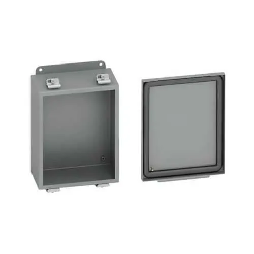 Feature: NEMA 4-rated enclosure provides dependable protection against dust and water intrusion. Business Impact: Upheld safety standards and reduced risk of downtime in harsh environments. Application: Control panels in manufacturing and outdoor installations benefit from rugged weather resistance. Feature: 16 gauge carbon steel with seamless poured-in-place gasket. Business Impact: Improved durability and gasket integrity translate to extended service life and lower replacement costs. Application: Industrial electrical cabinets in demanding environments; wall-mounted installations needing durable seals. Feature: External mounting feet and wall mounting capability simplify installation. Business Impact: Faster retrofit projects, reduced labor time, and cleaner, safer mounting configurations. Application: Retrofit of existing control panels or new line setups in factories and warehouses. Feature: Stainless door clamps and panel mount provisions enhance accessibility and security. Business Impact: Easy field servicing with secure door operation, minimizing unplanned maintenance. Application: Service-critical panels where quick access and reliability are essential. Feature: ANSI 61 gray painted finish with 16 inch height, 14 inch width, and 6 inch depth. Business Impact: Consistent aesthetics and predictable footprint for space planning and equipment placement. Application: Wall-mounted enclosures in machine rooms and secondary electrical spaces. Feature: UL 50, CSA C22.2 approvals and NEMA 4 rating. Business Impact: Regulatory compliance and confidence in performance for sensitive electrical systems. Application: Applications requiring certified protection in commercial and light industrial settings.