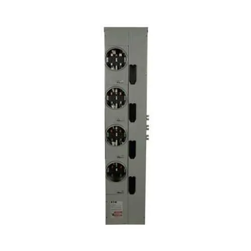 1MM420RRL Eaton: Eaton residential meter stack, Amperage rating: 200A, Bus rating: 800A, Outdoor, Interrupt rating depends on selected main circuit breaker, Single-phase in/single-phase out, 4 Sockets, Aluminum, Ringless, 120/240 Vac, 4-jaw