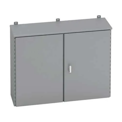 Feature: Rugged carbon steel construction with 12 gauge walls and a painted ANSI 61 gray finish. Business Impact: Delivers superior mechanical strength and corrosion resistance, reducing repaint cycles and early replacements. Application: Ideal for industrial control panels, outdoor process equipment, and utility installations. Feature: Type 3/3R enclosure with UL 50, CSA C22.2, and NEMA ratings. Business Impact: Provides dependable weather resistance and code-compliant protection for harsh environments, lowering risk of ingress and downtime. Application: Outdoor substations, process lines, and classrooms or labs with challenging conditions. Feature: Hinged cover with padlock provisions and a 3-point latching T-handle. Business Impact: Improves security and maintains a tight seal during operation, reducing unauthorized access and service interruptions. Application: Electrical distribution panels in manufacturing plants and automation environments. Feature: Wall mounting with external feet. Business Impact: Simplifies installation, reduces mounting complexity, and enables rapid retrofits without interior space disruption. Application: Space-constrained control rooms, machine centers, and retrofit projects. Feature: Medium double door design and ANSI 61 gray painted finish. Business Impact: Expands internal access for wiring and inspections while maintaining a consistent, durable appearance and reduced maintenance costs. Application: Large panel assemblies in utilities, data centers, and industrial facilities.