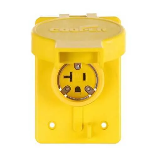 60W33 Eaton: Eaton Arrow Hart watertight straight blade single receptacle, #18-10 AWG, 20A, Industrial, Panel, 125V, Back wire, Yellow, Nickel-plated brass, IP66, Glass filled Nylon, 5-20R, Single, Screw, Glass-filled nylon, Core pack
