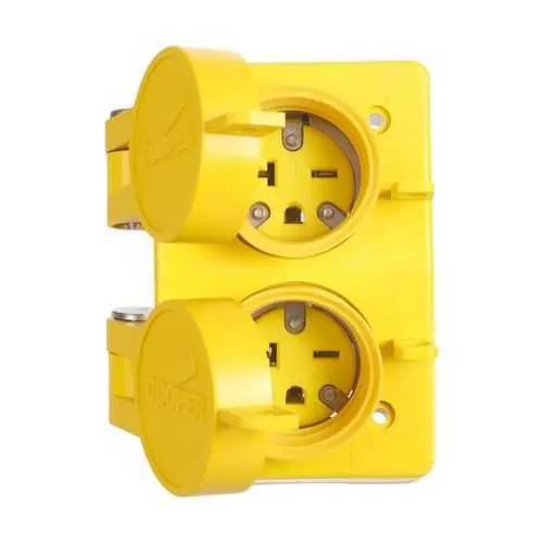 Feature: IP66-rated protection for damp/wet environments. Benefit: Prevents ingress of water and dust, reducing downtime and maintenance costs in harsh application areas. Application: Outdoor panels, wash-down stations, and mezzanine installations where reliability is critical. Feature: Back-wire and screw terminals. Benefit: Faster terminations with flexible wiring options, improving installation speed and reducing hand labor in field assemblies. Application: Panel enclosures and hard-to-reach junction boxes where space is limited. Feature: Glass-filled nylon body with nickel-plated brass contacts. Benefit: Excellent mechanical strength and corrosion resistance, extending service life in industrial settings. Application: Environments with vibration, chemical exposure, or frequent washdowns. Feature: NEMA 6-20R two-pole, 20A, 250V configuration. Benefit: Clear compatibility with common 250V circuits, minimizing mis-wiring and ensuring compliant power delivery. Application: Industrial panels and equipment rooms requiring rugged, high-visibility outlets. Feature: Color-coded yellow body and core-pack packaging. Benefit: Quick identification in large assemblies and minimal waste during stocking. Application: Large-scale installations and panel builds where inventory management matters.