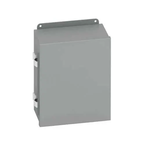 Installation begins with selecting a flat, plumb wall surface. Use the external mounting feet to align the enclosure, insert appropriate anchors, and tighten mounting screws to specification. The hinged cover and cont. pianohinge permit easy door operation during wiring, while the 16 gauge carbon steel body provides sturdy support for components mounted inside.
