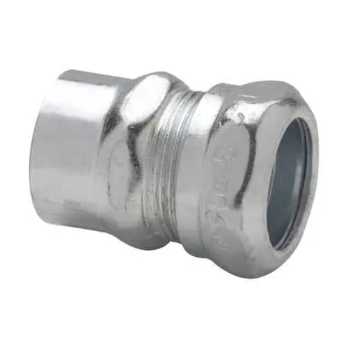Install by inserting the EMT into the compression portion and threading the rigid conduit into the opposite end, then tighten the hex collar until snug with a suitable wrench. Verify proper alignment and perform a light pull test to ensure a secure, vibration-resistant connection.