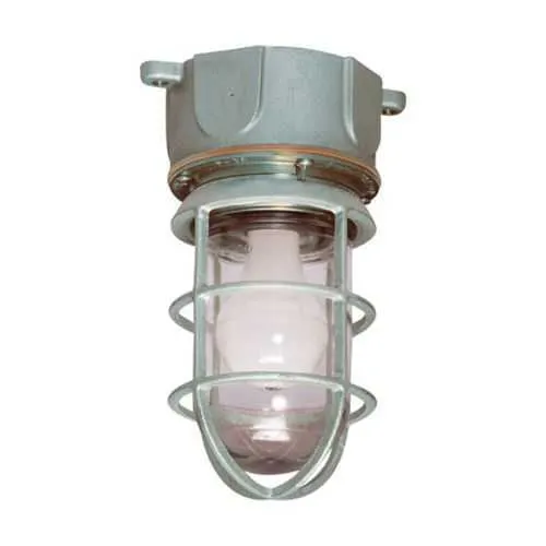 The 717A7 is designed for ceiling mounting and uses a medium base for incandescent lamps up to 150 watts. It supports typical A-21 sized bulbs and operates at 300 VAC, 50/60 Hz, making it compatible with many legacy industrial lighting circuits while maintaining a robust guard and globe assembly.