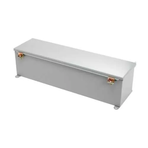 Feature: 8 inch height, 8 inch width, and 36 inch length in a 14 gauge steel trough. Business Impact: Provides ample conductor capacity while maintaining a compact footprint, reducing cabinet footprint and facilitating tidy cable management. Application: Ideal for machine controls and process line enclosures where space is at a premium. Feature: Seamless welded exterior with external mounting feet. Business Impact: Increases mounting rigidity and vibration resistance, lowering the risk of panel detachment in demanding environments. Application: Heavy-duty industrial installations with frequent vibration or movement. Feature: Hinged cover with heavy-duty hinges and screw clamps. Business Impact: Enables quick access for maintenance while maintaining secure enclosure integrity, reducing downtime. Application: Routine inspection, testing, and preventive maintenance in manufacturing cells. Feature: NEMA 12 rated enclosure. Business Impact: Protects conductors from dust and light moisture, improving reliability in dirty or humid facilities. Application: Chemical plants, automotive assembly, and general industry. Feature: 14 gauge steel, gray finish. Business Impact: Combines strength with corrosion resistance and a neutral color for easy integration into existing plant aesthetics. Application: New builds and retrofits where durability and consistent appearance matter. Feature: 36 inch long trough with external mounting feet. Business Impact: Simple, scalable installation across multiple panels, enabling standardized layouts and faster deployment. Application: Control rooms and panel houses requiring modular wiring paths.