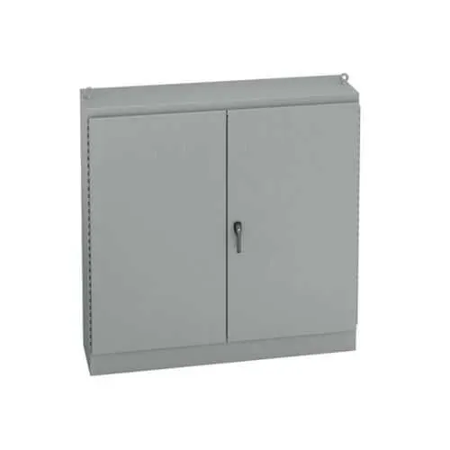 Feature: Carbon steel construction with 12 gauge wall offers robust physical protection and long-term durability in demanding environments. Business Impact: Reduces panel damage from impact, dust, and incidental moisture, lowering replacement costs and maintenance frequency. Application: Ideal for manufacturing floors, control rooms, and utility racks where heavy equipment and wiring demand rugged protection. Feature: NEMA 12 protection rating provides dependable ingress protection against dust and light liquid spills. Business Impact: Improves uptime by shielding critical controls from common industrial contaminants, supporting compliant operation in process and packaging lines. Application: Suitable for indoor process areas and dry/dusty environments where cleanliness and reliability are essential. Feature: Hinged cover with 3-point latching handle enables fast, secure access for maintenance. Business Impact: Speeds commissioning and servicing, reducing downtime while maintaining security. Application: Electrical distribution cabinets requiring quick fault isolation and routine inspection. Feature: Ground mounting with a large double door design enhances wiring access and installation flexibility. Business Impact: Simplifies cable routing and future expansion; reduces installation time and site modification costs. Application: Factory floors and utility rooms where floor mounting is preferred and space is at a premium. Feature: Oil-resistant gasket and ANSI 61 gray finish provide environmental resilience and consistent appearance. Business Impact: Prolongs seal integrity under lubricant exposure and delivers a professional, low-maintenance aesthetic. Application: Enclosures in machinery areas with oil or lubricant exposure, or where compliance with cosmetic standards matters.