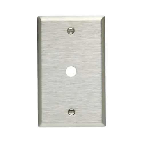 The 93696-BOX is a standard single-gang stainless steel wallplate featuring a 0.375 inch cutout and a 0.625 inch hole, designed for telephone and coax connectors. It fits standard 1-gang enclosure openings and aligns with typical KO patterns, enabling straightforward field terminations and retrofits.