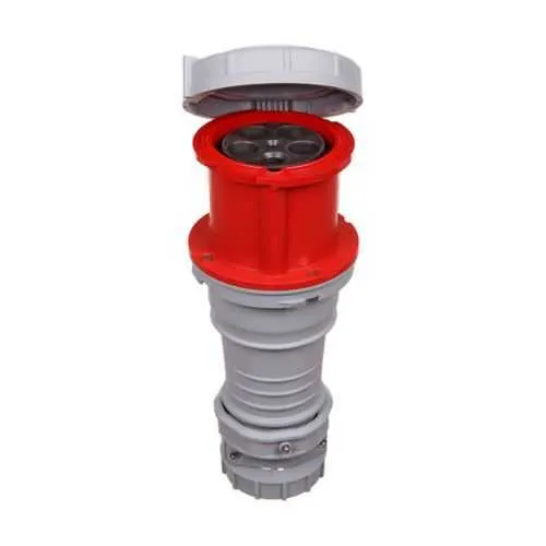 The connector is rated for 100/125A with a voltage range of 100/125A at 200-415V. It is a four-pole device with five wires total including grounding. Contacts are nickel-plated brass, housed in a nylon body, delivering robust corrosion resistance and reliable current transfer in demanding environments.
