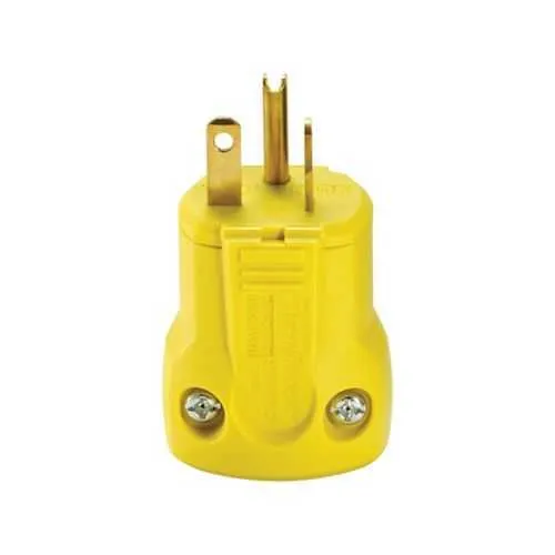The plug is rated at 20A and 125V, with a two-pole, three-wire grounding configuration (5-20P). It uses brass contacts and a yellow nylon body with a polycarbonate housing for durable, high-visibility performance.