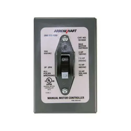 Yes. The AH7810GD is a three-phase, three-pole manual motor controller rated at 30A and 600V. It features a single-gang, two-position, maintained contact toggle switch and a wall-mount design, making it ideal for standard industrial motors in automation, conveyors, and pumps. The device uses a stainless steel NEMA 1 enclosure to protect against dust and incidental contact in harsh environments.