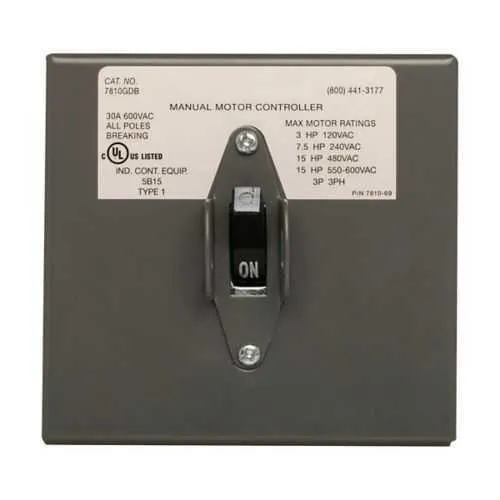 Yes. The AH7810GD is a three-phase, three-pole manual motor controller rated at 30A and 600V. It features a single-gang, two-position, maintained contact toggle switch and a wall-mount design, making it ideal for standard industrial motors in automation, conveyors, and pumps. The device uses a stainless steel NEMA 1 enclosure to protect against dust and incidental contact in harsh environments.