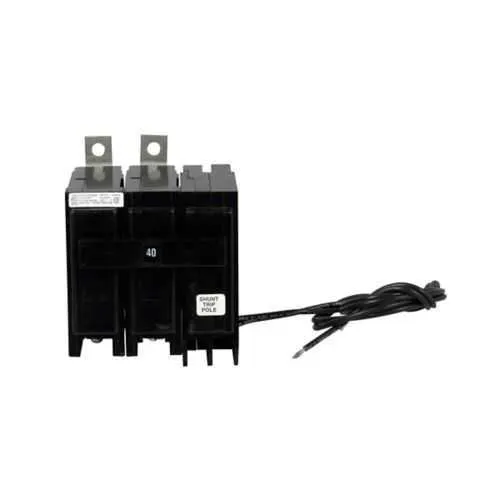 The device is a two-pole thermal-magnetic circuit breaker rated at 40 A with an interrupt capacity of 10 kAIC, and a voltage rating of 120/240 V. It features a 24/48 V DC shunt trip option for remote signaling, and a non-interchangeable trip characteristic to preserve specific protection settings within a panel.