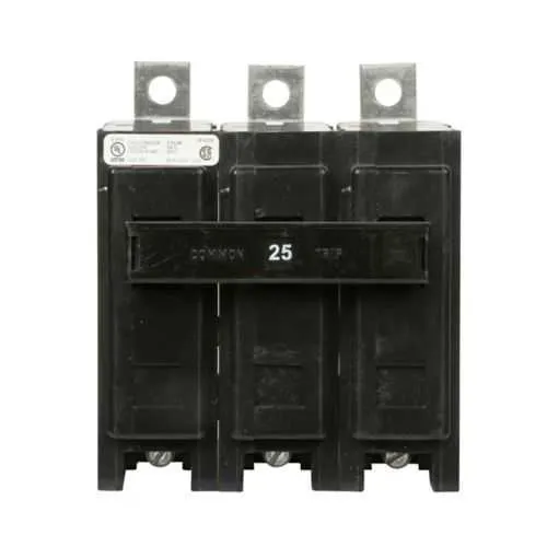 Install the BAB3025C using bolt-on mounting for a secure fit in standard enclosure cutouts. It is a three-pole device designed for 120/240 V systems. For torque specs and exact installation guidance, refer to the Eaton specification sheet (BAB3025C) to ensure proper seating and insulation on retrofit or new builds.