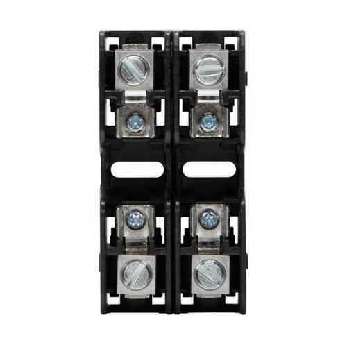 This two-pole modular fuse block is ideal for control panels and compact automation circuits in manufacturing environments. It provides space-efficient overcurrent protection in tight electrical cabinets and is compatible with Bussmann series components for standardized machine wiring.