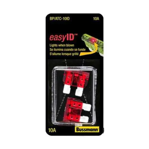 Feature → Business Impact → Application: ATC blade fuse design enables rapid diagnostics and fast replacement in congested panels, reducing downtime and maintenance labor costs in industrial facilities and vehicle harnesses. Feature → 32 Vdc rating and 10 A current rating provides dependable short-circuit protection for common control circuits, delivering predictable performance in motor drives and DC power rails. Feature → 1 kAIC interrupt rating ensures reliable fault interruption, improving safety and minimizing collateral damage in fault conditions across automation panels. Feature → UL Listed and RoHS Compliant certifications support regulatory compliance and supplier-recognition programs, smoothing audits and supplier qualification in food, pharma, automotive, and energy sectors. Feature → Red color and easyID branding offer quick fuse identification during routine servicing, decreasing guesswork in spare-part inventories and maintenance schedules. Feature → Compact dimensions (0.75 in L, 0.49 in W, 0.2 in H) and standard packaging (2 pcs) enable dense installation in space-constrained panels and small control boxes, improving layout efficiency and part compatibility with ATC fuse holders.