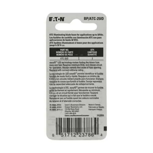 The BP/ATC-25ID is an ATC-type blade fuse designed for Eaton Bussmann ATC fuse holders. It fits standard ATC bases and ships as a 2-pack. Its 25 A, 32 Vdc rating and 1 kAIC interrupt rating ensure reliable DC protection in control panels and equipment. It is UL Listed and RoHS compliant.