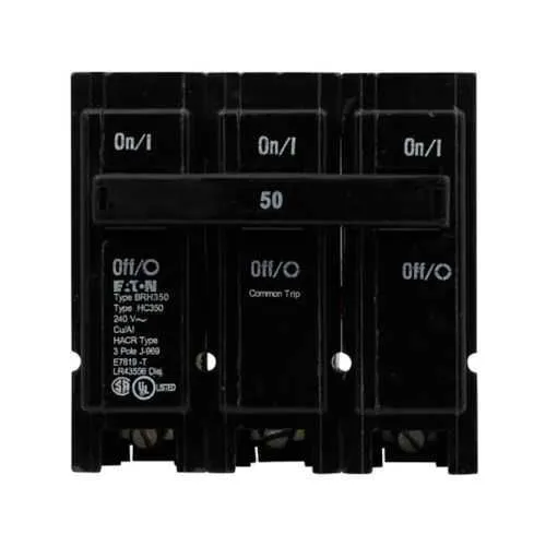 BRH350 Eaton: Eaton BR thermal magnetic circuit breaker,Type BR 1-Inch plug-on circuit breaker,50 A,22 kAIC,Three-pole,240V,BRH,Common breaker trip,#14-4 AWG Cu/Al,Q28,BRH,Type BR Loadcenters