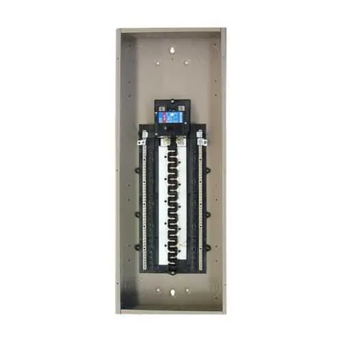 This load center features a 25 kAIC interrupt rating and copper bus material. The high interrupt rating provides enhanced short-circuit protection for moderate to heavy load scenarios, while the copper bus minimizes resistance, reducing voltage drop and improving overall system efficiency during fault conditions.